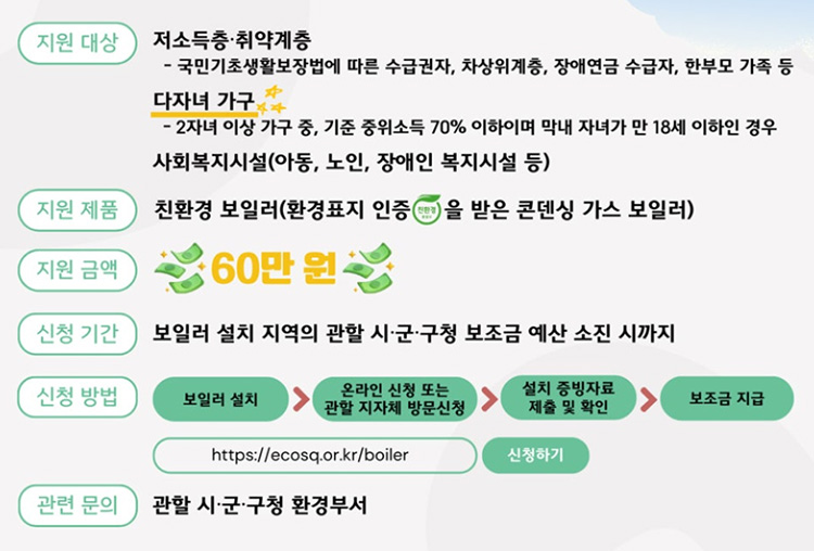- 신청기간 : 25년 2월 3일 ~ 12월 15일 (보일러 설치 지역의 관할 시, 군, 구청 보조금 예산 소진 시 마감)