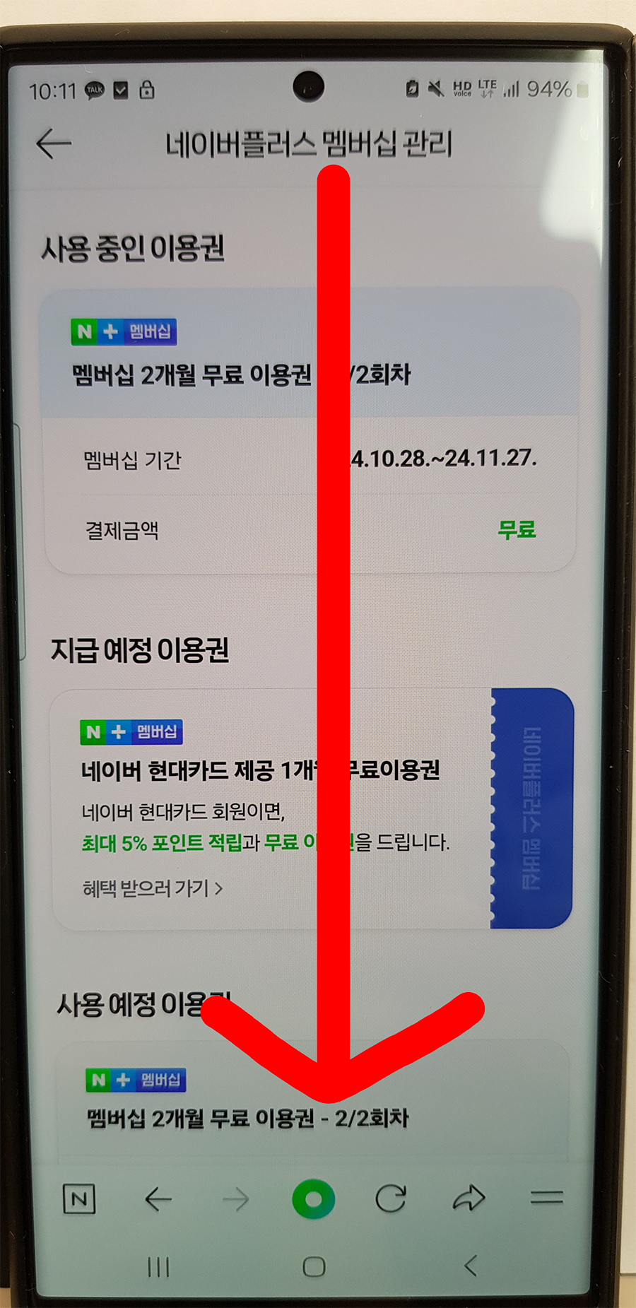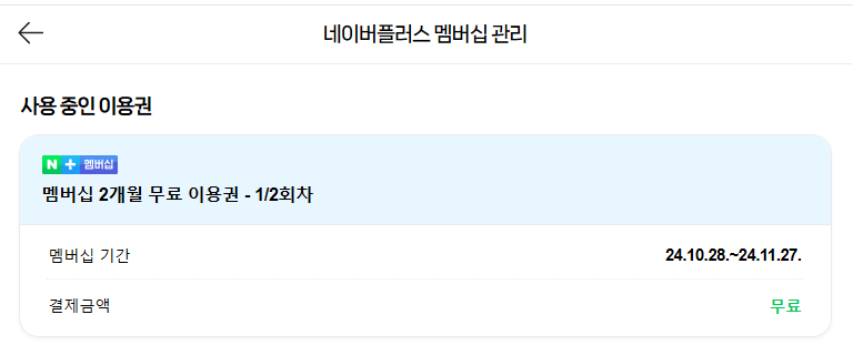 아래 저의 멤버십 관리 캡쳐본을 보면, 현재 네이버멤버십 2개월 무료 이용권을 사용 중입니다.
