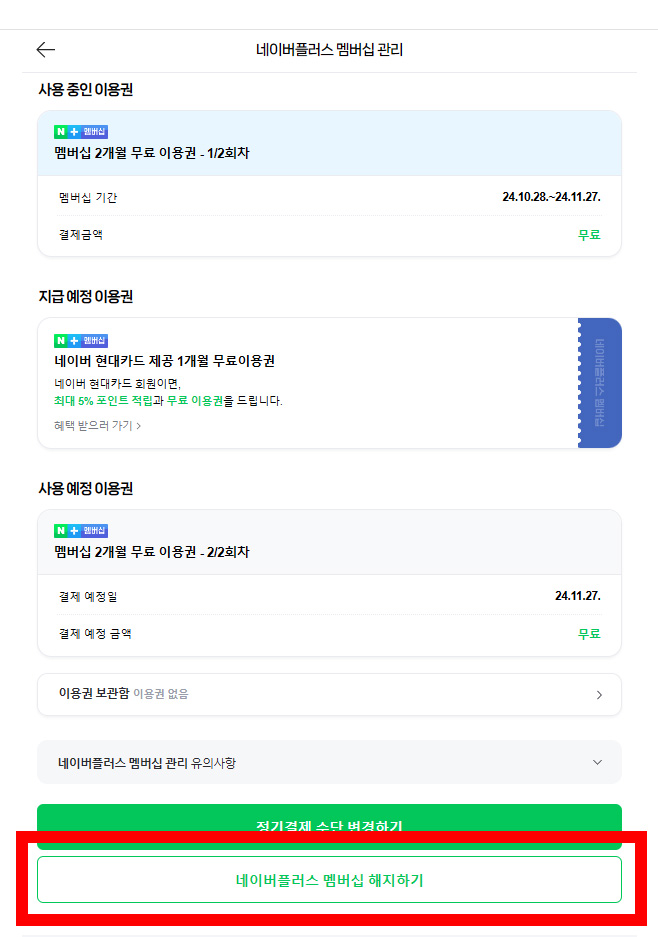 요약하면, 네이버 멤버십 해지를 시도했을 때, 마지막 해지단계에서 2개월 무료 이용권이 나오면 선택하시면 됩니다.