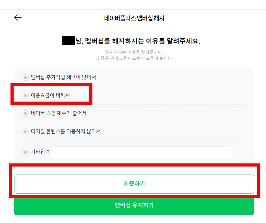 7. 해지이유 중 '이용요금이 비싸서'를 클릭 후, 제출하기를 클릭합니다.