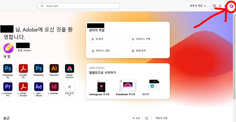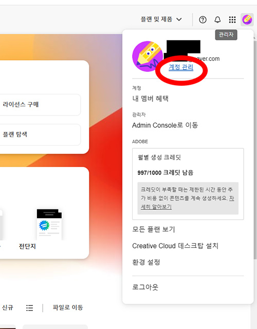- 어도비 홈페이지로 들어가서 제일 우측에 계정을 클릭합니다