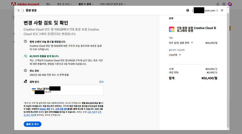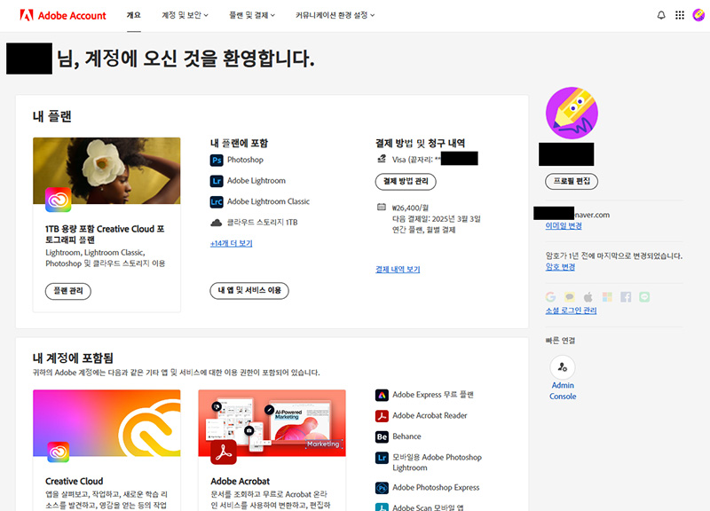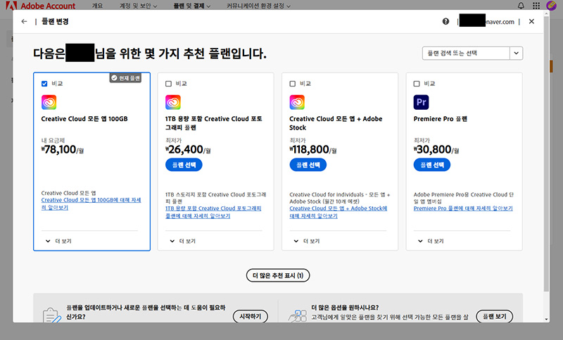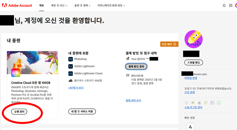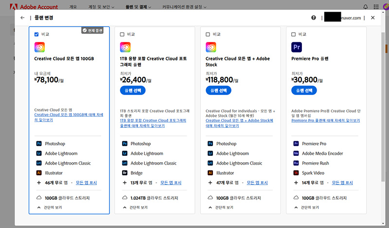 어도비 포토샵 플랜 변경 방법 홈페이지 바로 가기